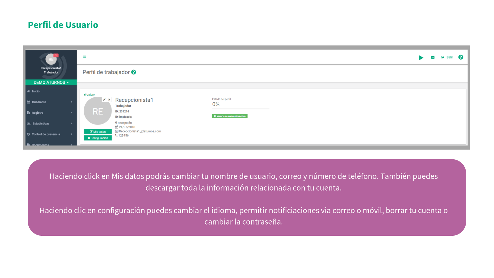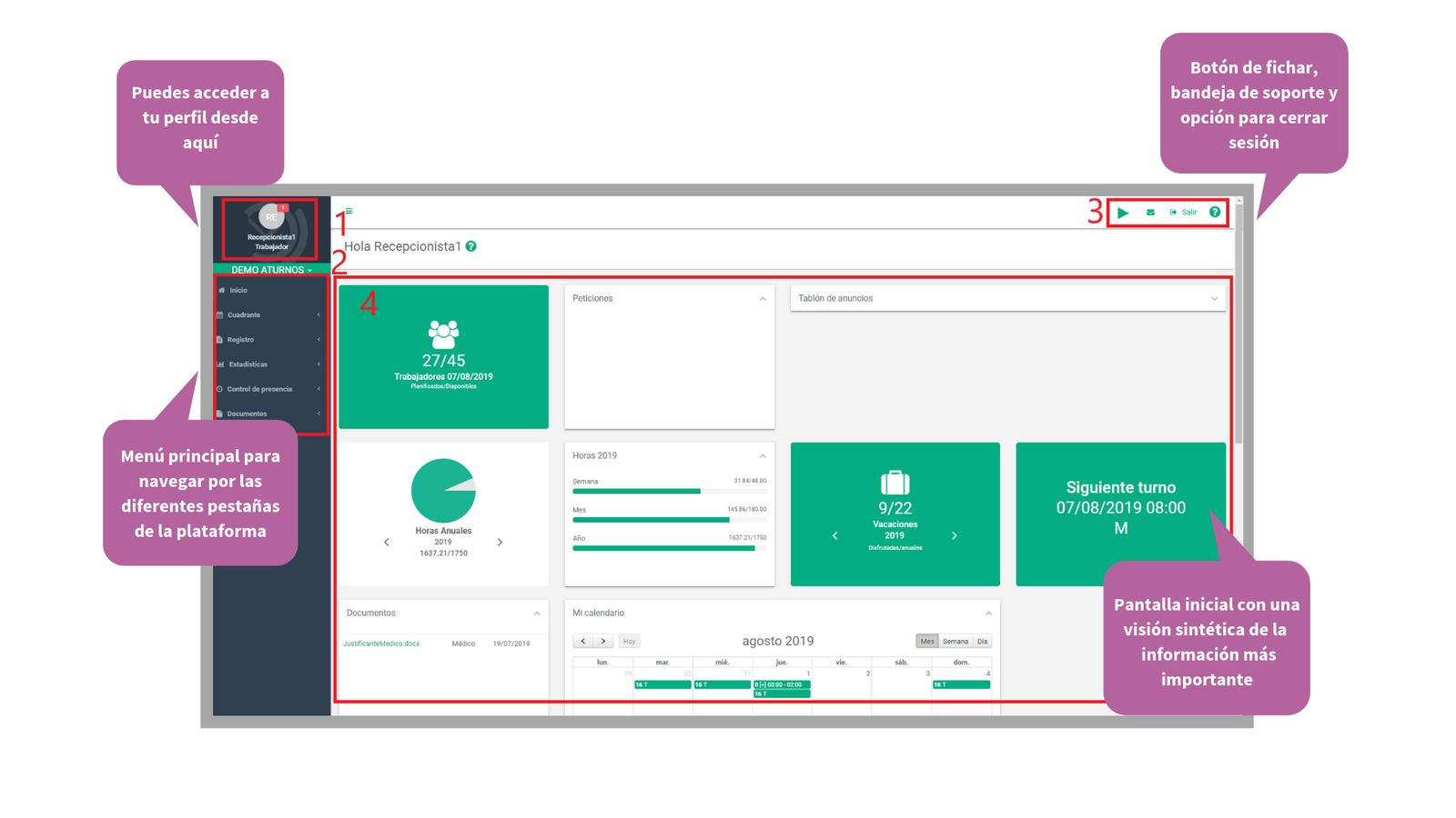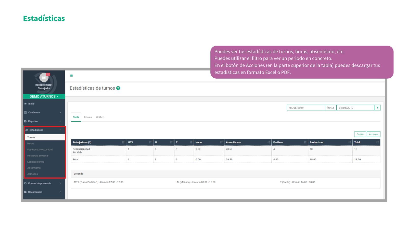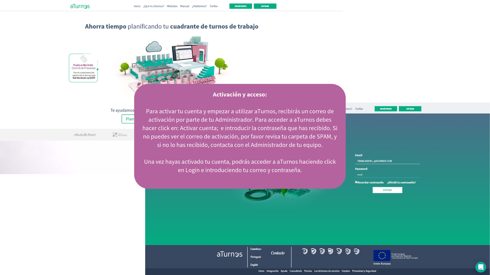 En la siguiente presentación va a poder ver cómo se puede empezar en aTurnos (el proceso de activación de la cuenta de usuario) así cómo las distintas pestañas de nuestra plataforma como: el cuadrante de turnos, las peticiones de permisos (absentismos) así como de vacaciones, los cambios de turno entre compañeros, estadísticas de turnos, horas y absentismos, y por último, todo lo relacionado con el control de presencia: realizar marcajes y consultar marcajes anteriores.