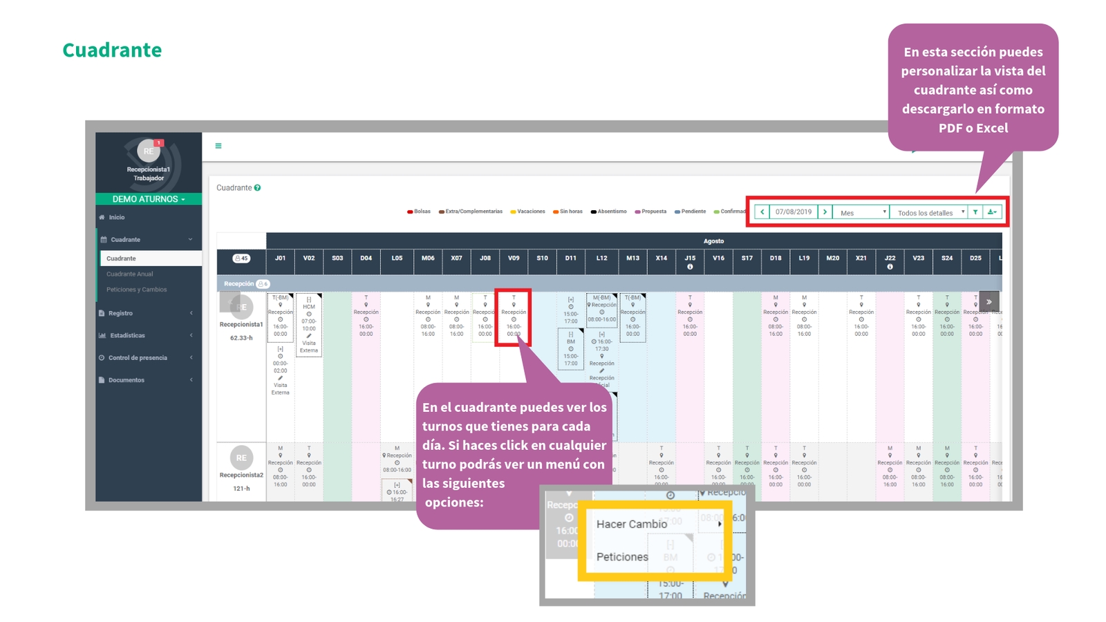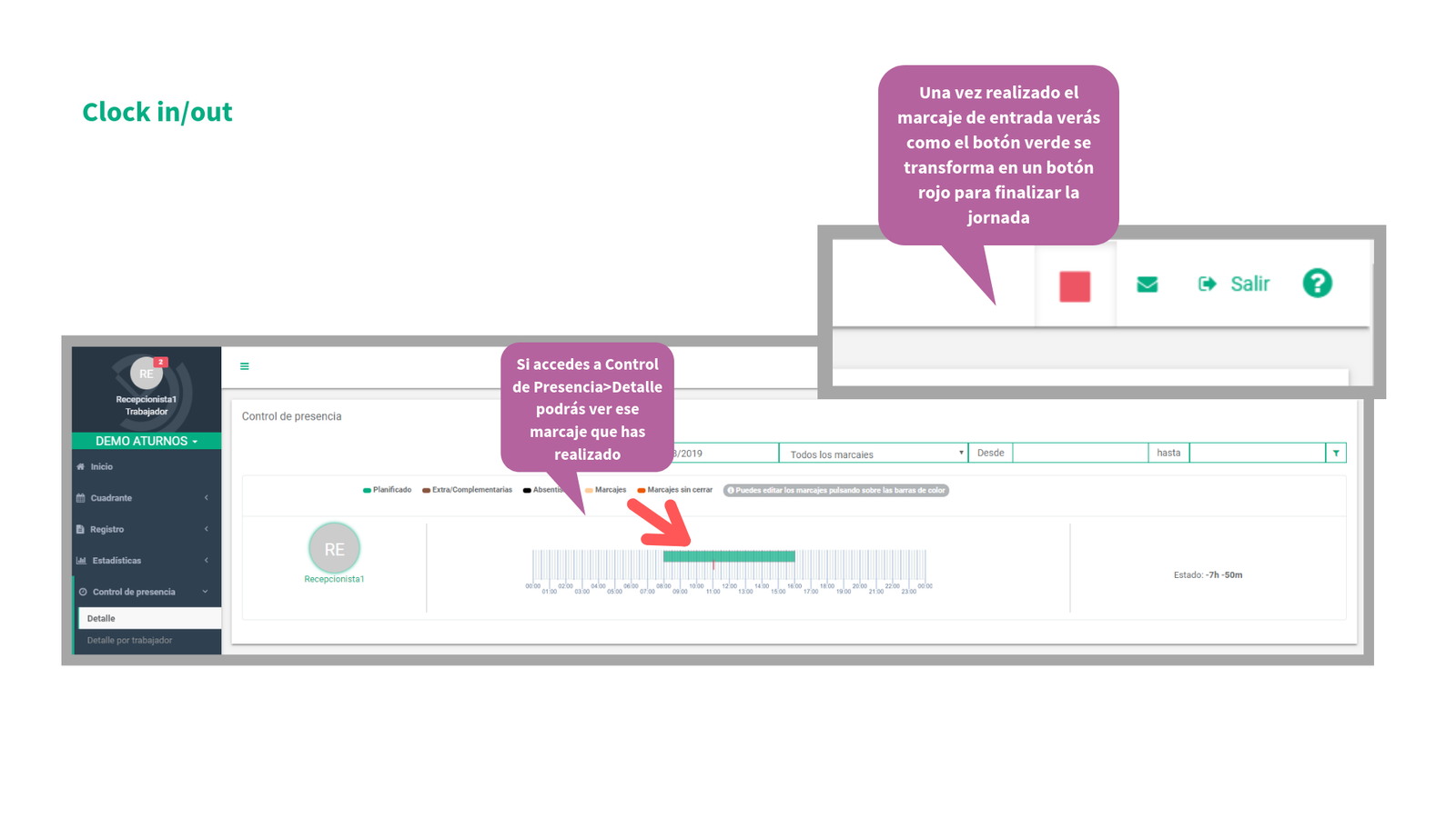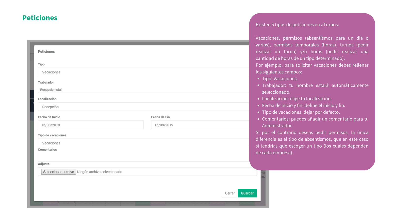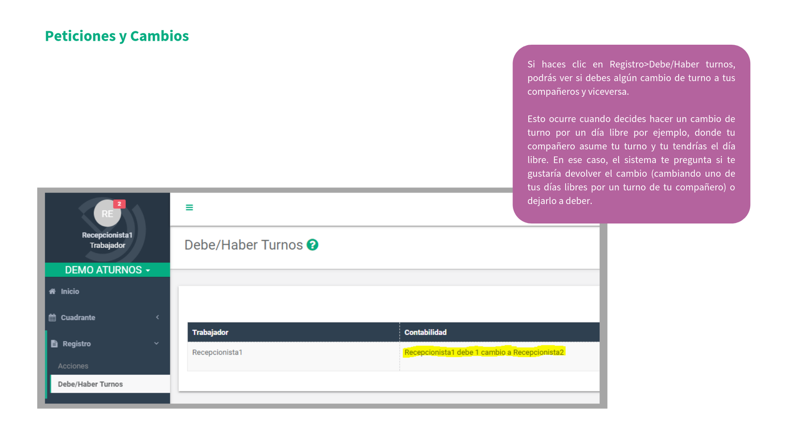 En la siguiente presentación va a poder ver cómo se puede empezar en aTurnos (el proceso de activación de la cuenta de usuario) así cómo las distintas pestañas de nuestra plataforma como: el cuadrante de turnos, las peticiones de permisos (absentismos) así como de vacaciones, los cambios de turno entre compañeros, estadísticas de turnos, horas y absentismos, y por último, todo lo relacionado con el control de presencia: realizar marcajes y consultar marcajes anteriores.